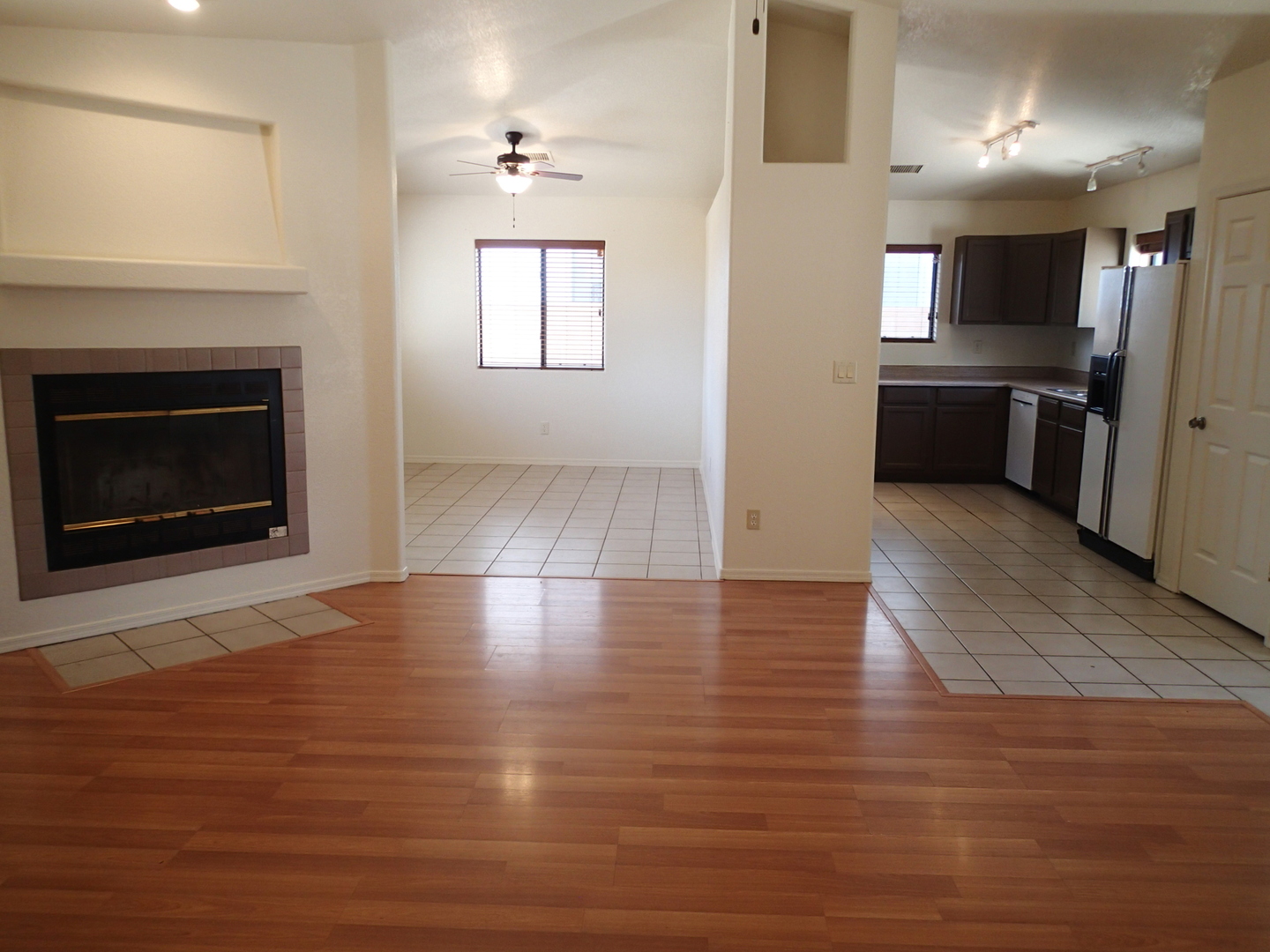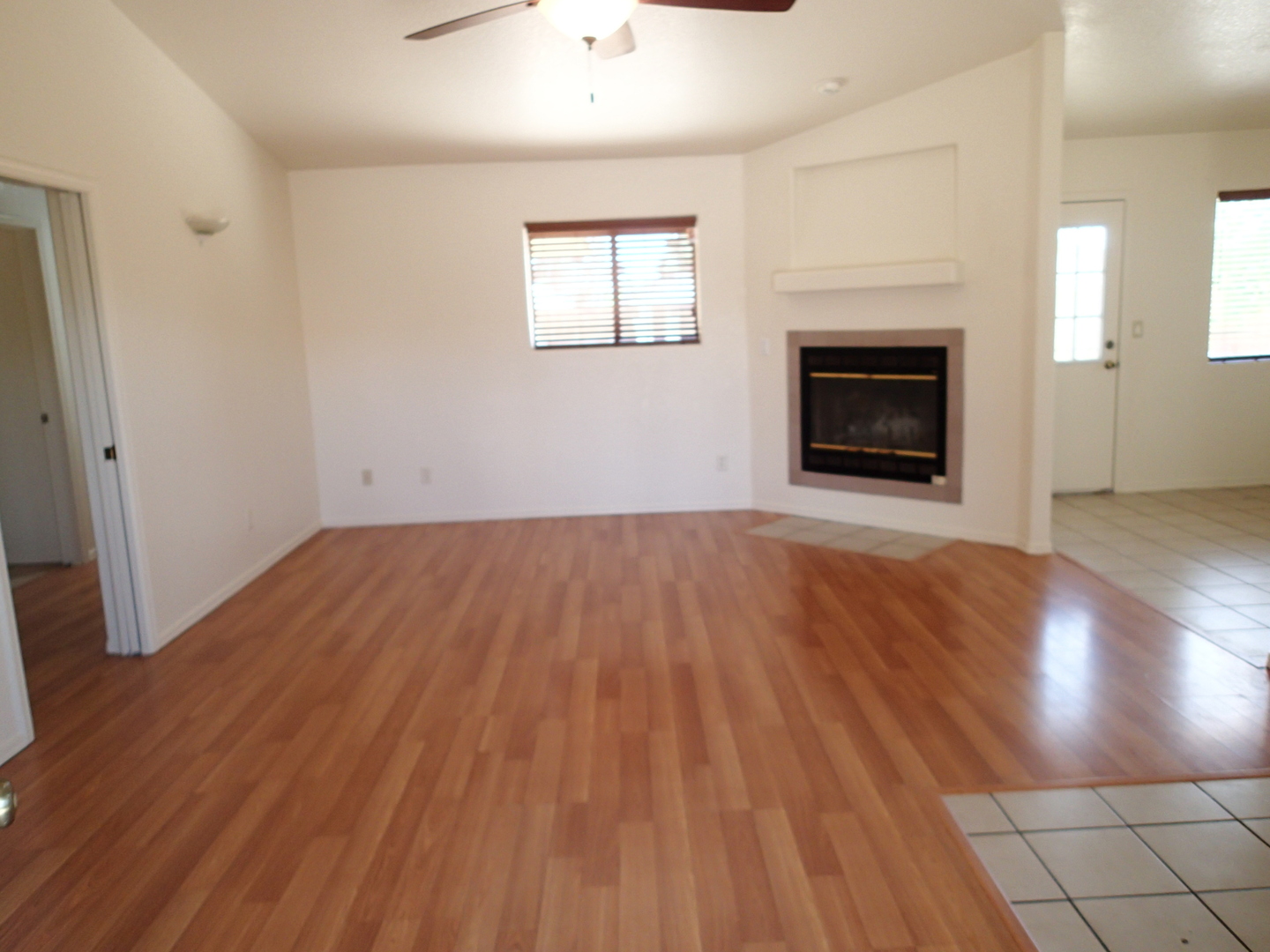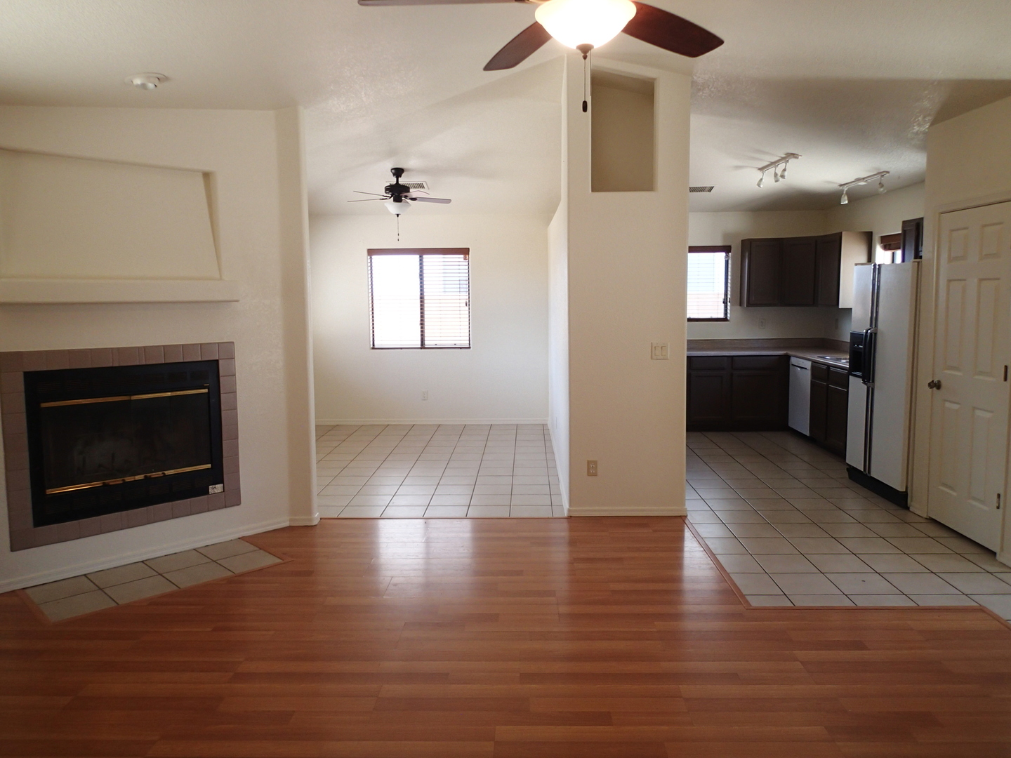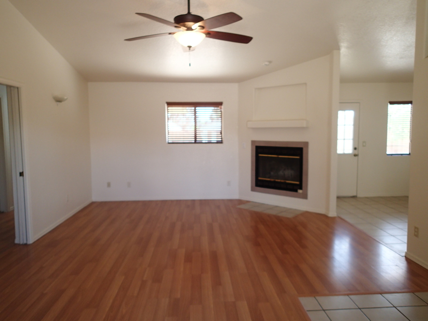 Very pleasant and welcoming house with wood laminate and tile floors, wood burning fireplace in living room draws the attention when entering, separate dining room behind the kitchen with an electric stove, dishwasher, garbage disposal, microwave above stove, two pantry closets, 3 bedrooms, 2 baths, family bath has shower/tub combination, ceiling fans in all bedrooms, living room and dining room, nice size closets, master bedroom has a walk in closet, master bath has a separate walk in shower, central a/c, wood blinds throughout, 2 car garage, patio in backyard, block wall fence in backyard, desert landscaping. Ready for occupancy, come see and move in. Pets case by case small only.