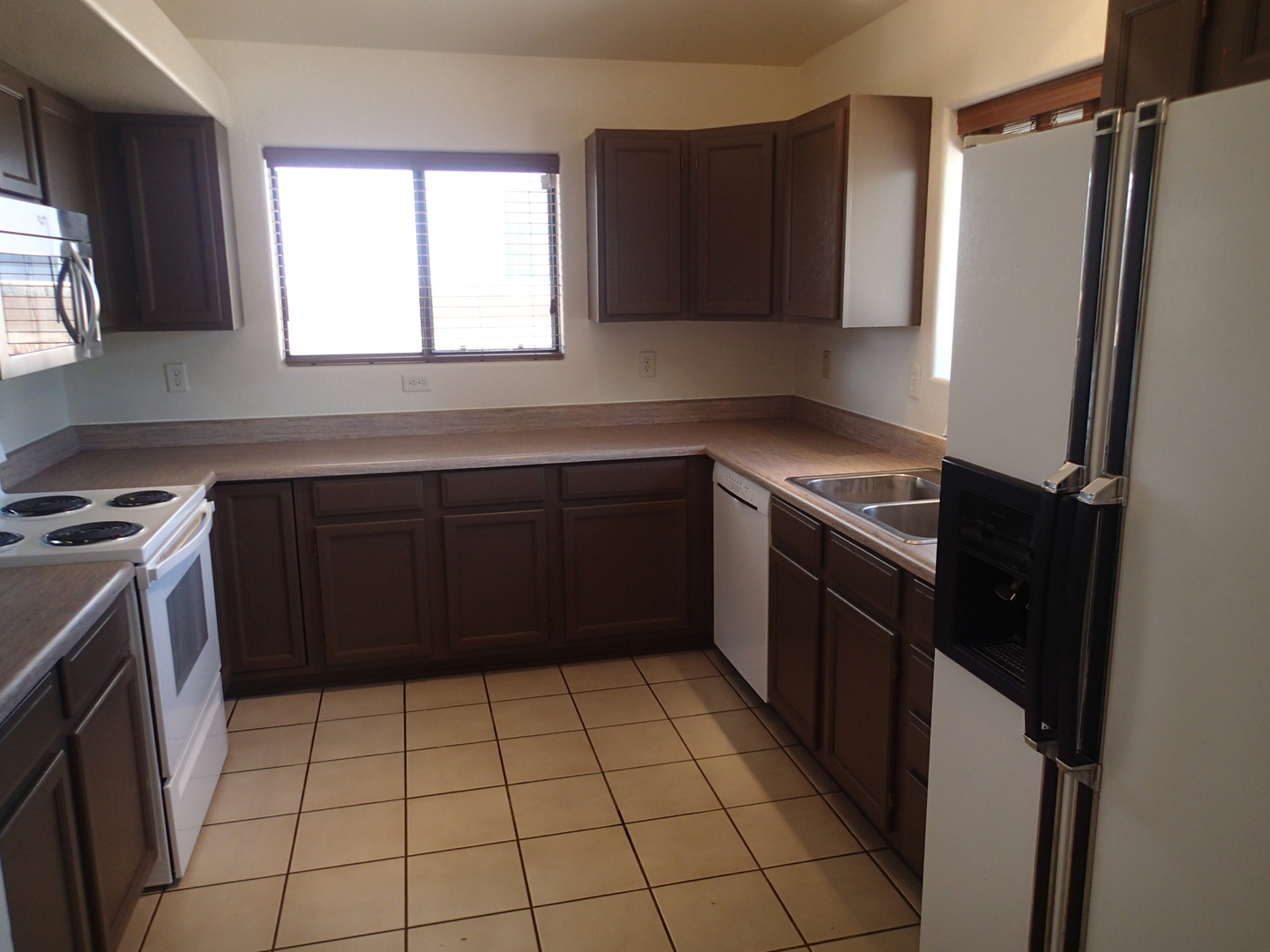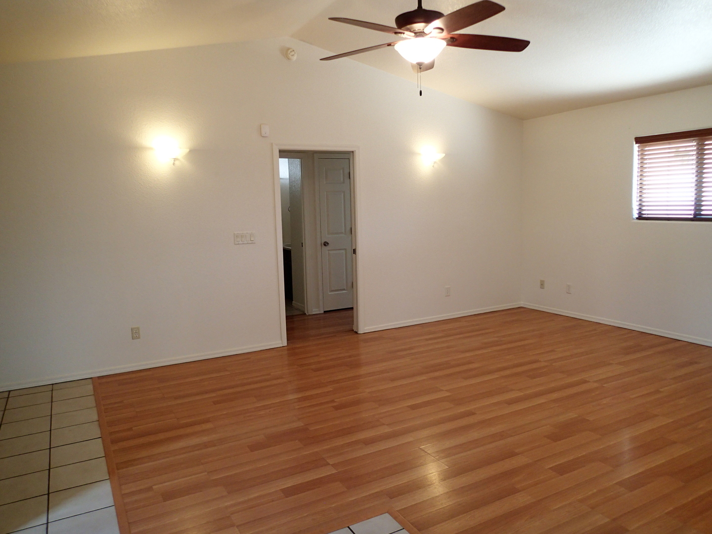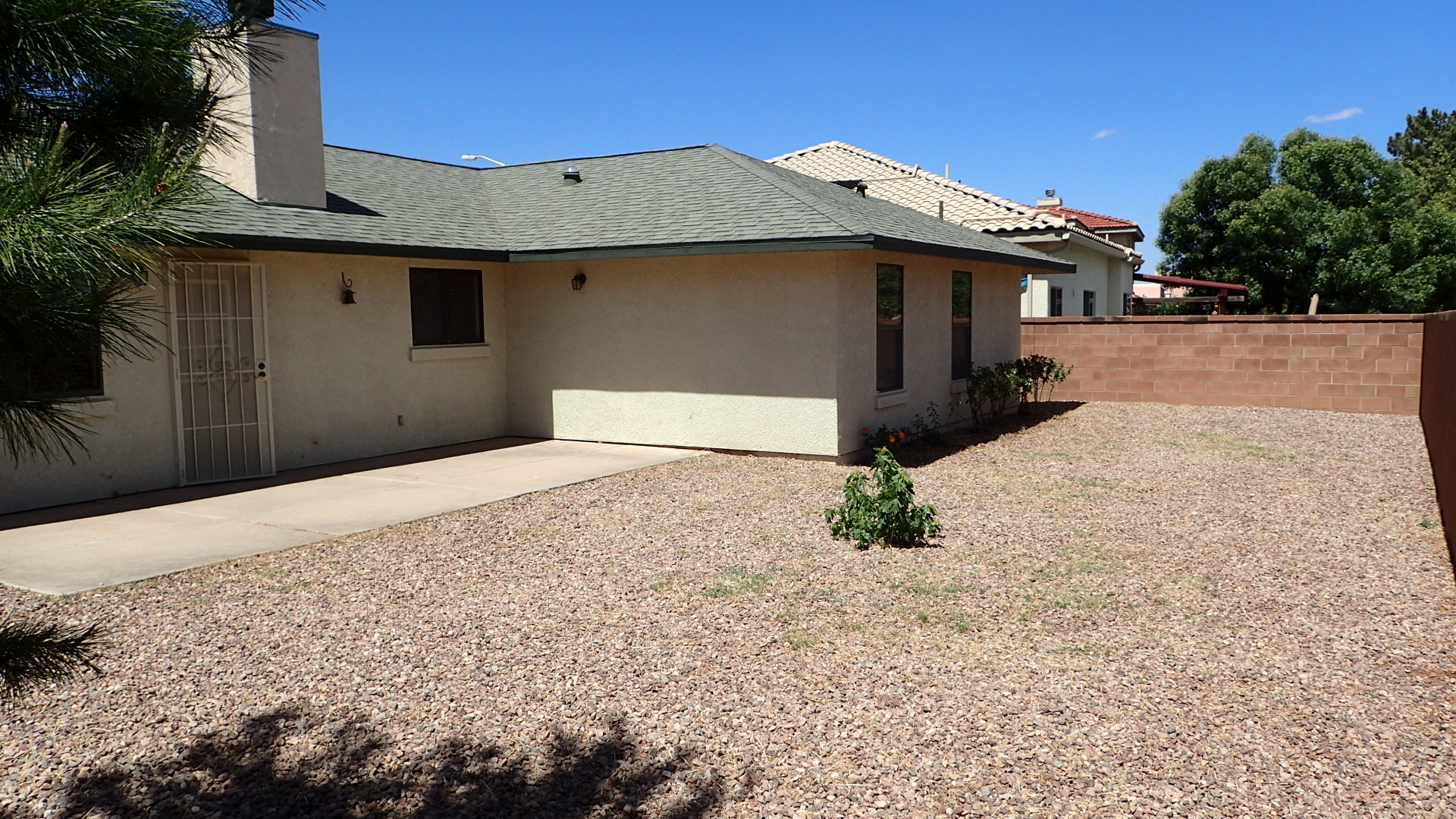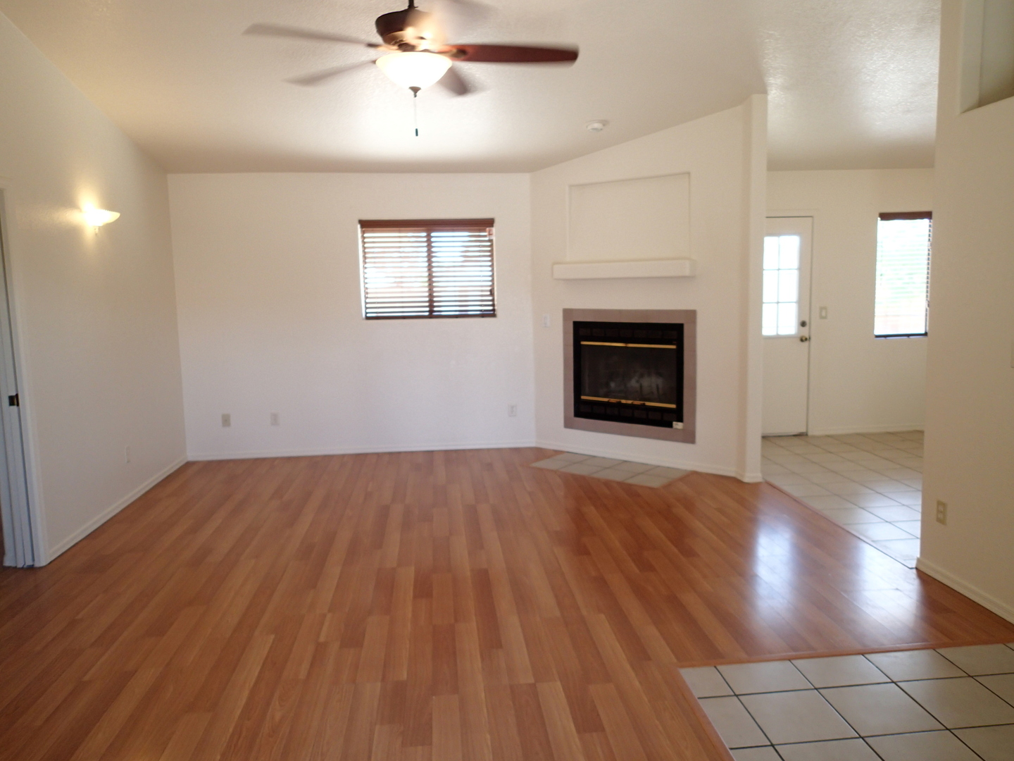 Very pleasant and welcoming house with wood laminate and tile floors, wood burning fireplace in living room draws the attention when entering, separate dining room behind the kitchen with an electric stove, dishwasher, garbage disposal, microwave above stove, two pantry closets, 3 bedrooms, 2 baths, family bath has shower/tub combination, ceiling fans in all bedrooms, living room and dining room, nice size closets, master bedroom has a walk in closet, master bath has a separate walk in shower, central a/c, wood blinds throughout, 2 car garage, patio in backyard, block wall fence in backyard, desert landscaping. Ready for occupancy, come see and move in. Pets case by case small only.